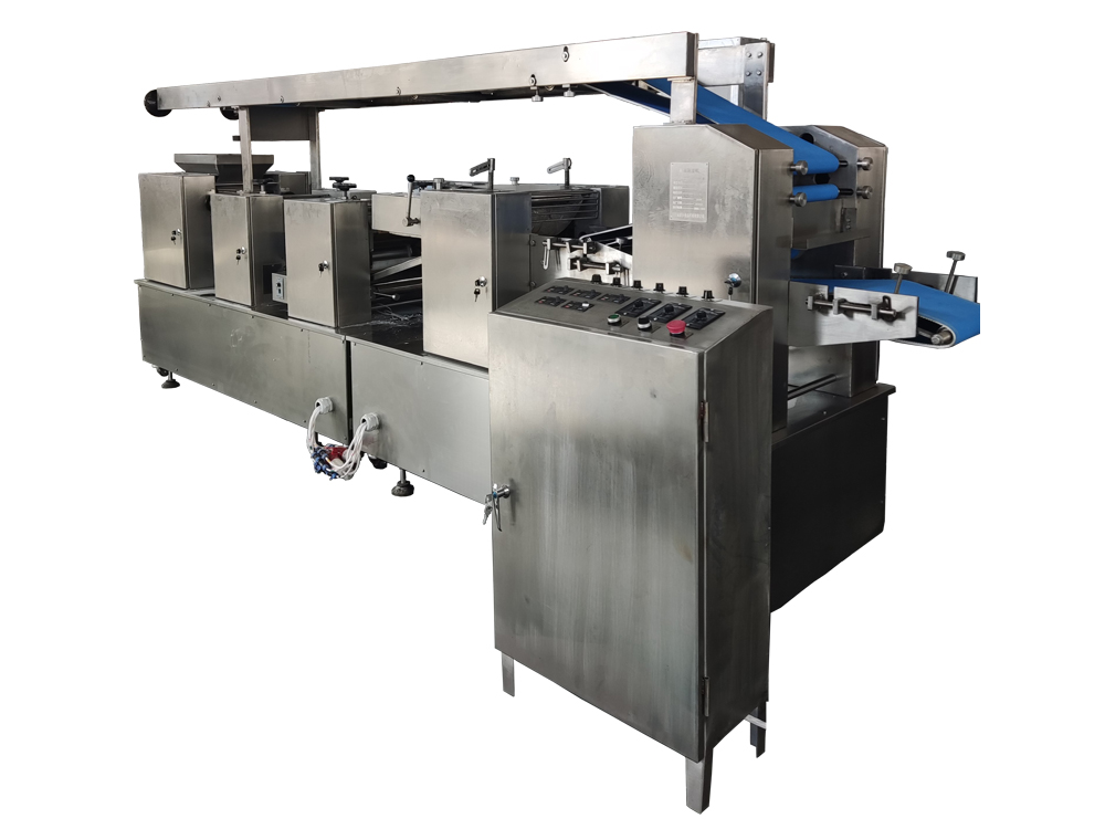 制皮機(jī)為臥式成型機(jī),通過(guò)傳送機(jī)構(gòu)將各道軋輥線速度比合理分配,實(shí)現(xiàn)從投料到制皮成型自動(dòng)化生產(chǎn)。適用于餃子皮、餛飩皮、燒麥皮、蒸餃皮、以及燙面類(lèi)面皮成型。