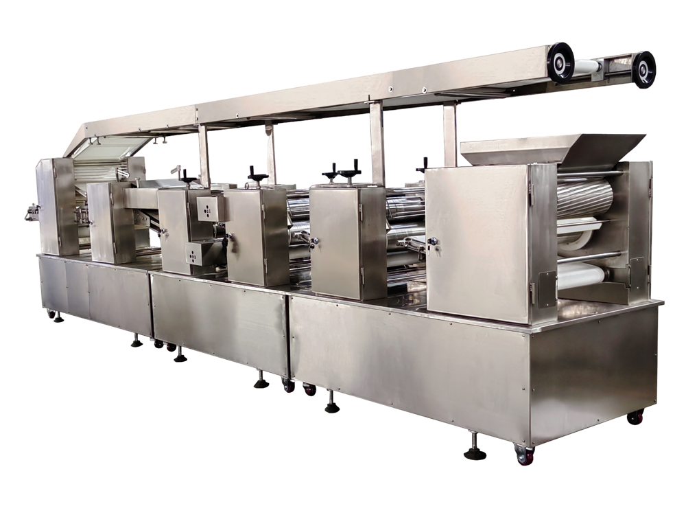 3、設(shè)備為變頻控制,每一道壓輥都采用單機(jī)驅(qū)動(dòng),通過測(cè)距傳感器,實(shí)現(xiàn)自動(dòng)面帶張緊控制,多輥聯(lián)動(dòng)??焖佥p松地制作大量面皮,提高生產(chǎn)效率。